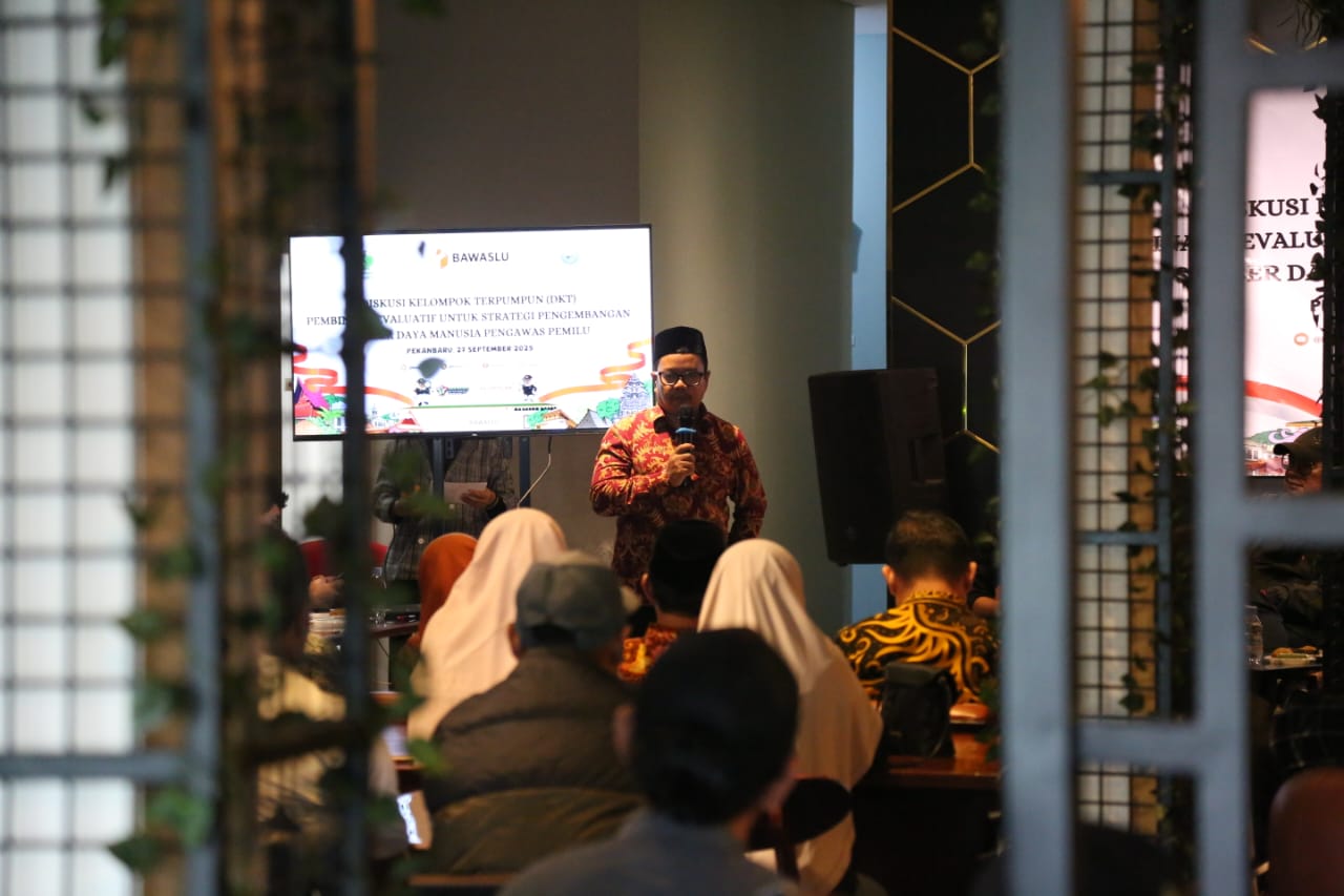 SEBALIK.COM, PEKANBARU – Pimpinan Bawaslu Provinsi Riau mengikuti kegiatan Diskusi Terpumpun Pembinaan Evaluatif untuk strategi pengembangan Sumber Daya Manusia (SDM) pengawas Pemilu. Kegiatan ini berlangsung di Café Cemara Ostaria, Pekanbaru, pada Sabtu (27/9/2025).